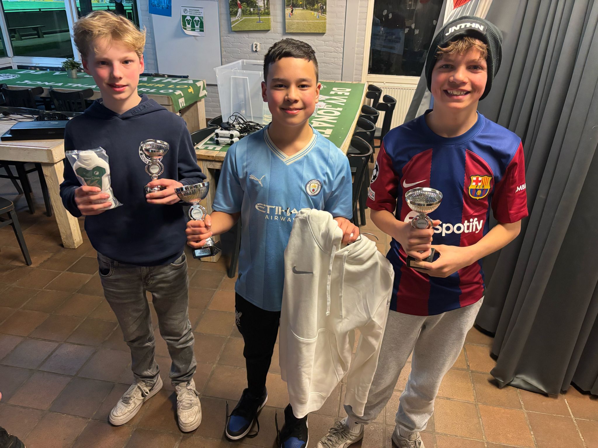 Na een spannende knock-out fase ging de derde prijs naar Stijn Amesz (JO13-6), die in de halve finale werd uitgeschakeld door zijn teamgenoot Gijs Barendrecht (JO13-6). Onder luide aanmoediging van de inmiddels afgevallen deelnemers nam Gijs, spelend met Manchester City, het in de finale op tegen Daley Hogervorst (JO12-7), spelend met Real Madrid.