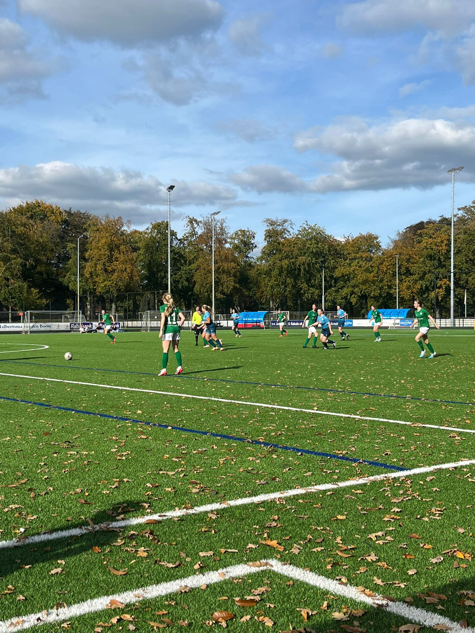 De bladeren dwarrelen naar beneden. Een waterig zonnetje komt zo nu en dan door. Verder is het vooral een Hollandse wolkenpartij met weinig wind. Een ideale middag voor een goede pot voetbal.